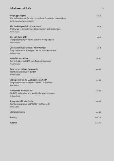 Im Mittelpunkt der Handreichung steht die Auseinandersetzung mit den Argumentationsmustern und Interventionsmethoden rechtsextremer Parteien, über deren Verbot allenthalben zwischen Ländern und Bund verhandelt wird.