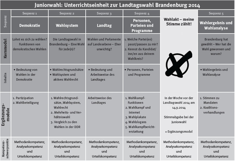 Modulcharakter: Die Sequenzbereiche werden anhand von Unterrichtsmodulen konkretisiert. Dabei stellen die „Kernmodule“ eine mögliche Reihenfolge an Pflichtbausteinen dar, die aus langjähriger Erfahrung dieses Projektes für eine inhaltliche Vorbereitung der Juniorwahl notwendig sind. Anhand der „Ergänzungsmodule“ können zusätzliche Inhalte einer Sequenz thematisiert bzw. vertieft werden.